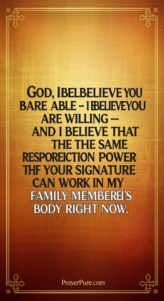 God, I believe You are able — I believe You are willing — and I believe that the same resurrection power that is Your signature can work in my family member’s body right now.