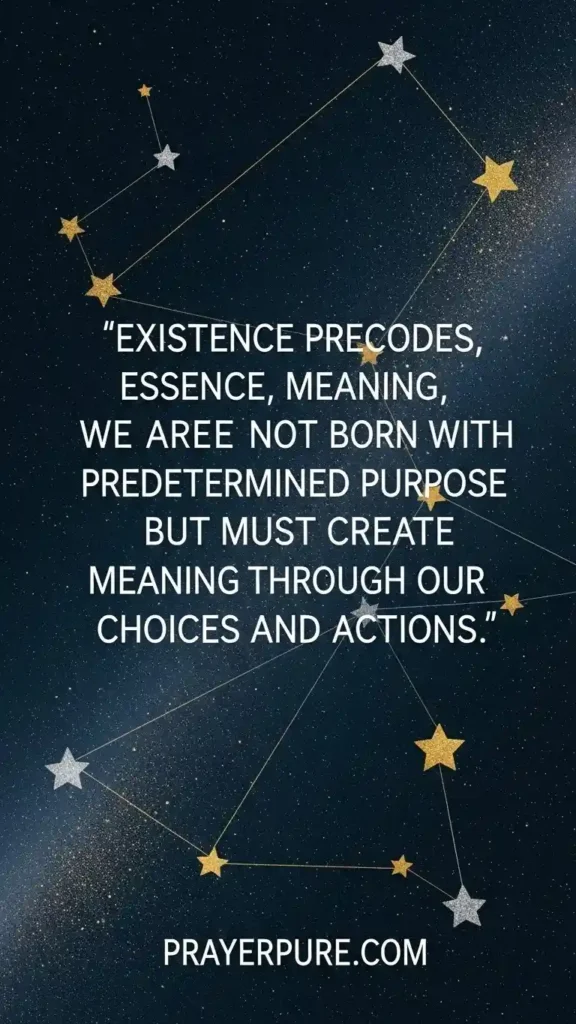 Existence precedes essence, meaning we are not born with predetermined purpose but must create meaning through our choices and actions.