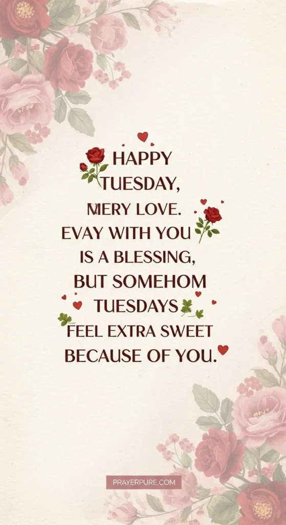 Happy Tuesday, my love. Every day with you is a blessing, but somehow Tuesdays feel extra sweet because of you. May this Tuesday remind you how deeply you are loved — not just by me, but by a God who designed you perfectly. Sending you Tuesday love wrapped in warmth, dusted with gratitude, and sealed with the most sincere prayer for your joy. On this blessed Tuesday, I choose you — your laughter, your heart, your dreams, and every Tuesday we’ll ever share. May your Tuesday be as beautiful as the way you make everyone around you feel seen, valued, and completely enough. I don’t need the weekend to be happy — any Tuesday spent loving you is already the best day of my life. To the person who is my home, my peace, and my favorite blessing — happy Tuesday, and thank you for existing. May this Tuesday bring softness to your heart and remind you that love, like God’s grace, is always available to you. You are someone’s reason to smile on a quiet Tuesday morning. Never underestimate the power of your presence. Happy blessed Tuesday to the one who made me believe in beautiful things again. You are my greatest answered prayer.