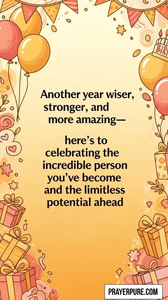 Another year wiser, stronger, and more amazing—here’s to celebrating the incredible person you’ve become and the limitless potential ahead.