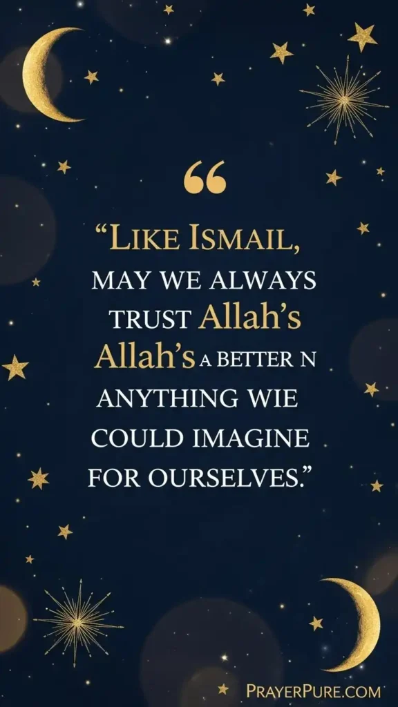Share them on social media to inspire your friends and followers during challenging times, include them in personal journals as daily reflections for spiritual growth, send them as messages of encouragement to loved ones facing difficult decisions, or display them in your home as beautiful reminders of faith and patience. Teachers and parents can use these quotes to introduce children to the beautiful story of Prophet Ismail, while individuals can meditate on them during prayer times or moments of uncertainty. Each quote serves as a doorway to deeper contemplation about sacrifice, obedience, trust, and the infinite mercy of Allah.
